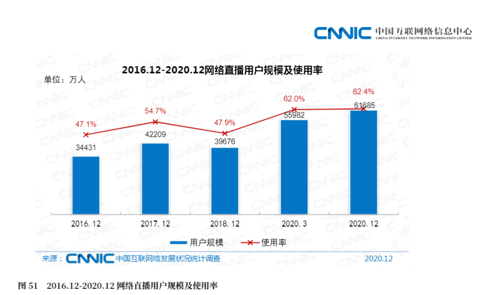 CNNIC数据显示,截至2020年12月,我国网络直播用户规模达6.17亿,较2020年3月增长5703万,占网民整体的62.4%。