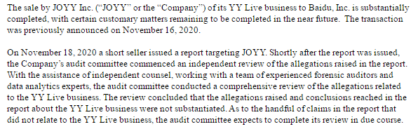 欢聚集团还表示,浑水有关 YY Live 业务的指控和得出的结论在经过独立审查后,没有得到证实。