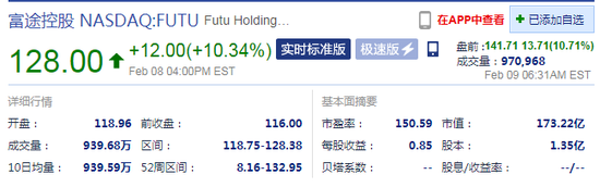 富途控股盘前涨幅扩大至10.71%,报141.71美元,开盘股价势将刷新历史高位。