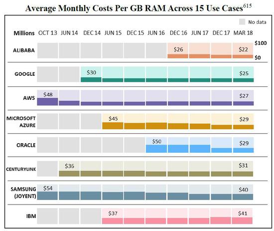如下图所示,IaaS的价格随着时间的推移而下降,根据RBC Capital Markets 2018年的一份报告,这三家美国主要提供商的服务定价低于30美元/GB RAM。市场参与者将这种趋势解释为云服务提供商具备规模经济效应以及更关注从PaaS和SaaS产品中增加收入,而非更关注从IaaS产品获得收入。
