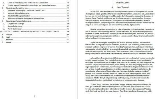 报告开宗明义,指出此次调查由两党共同发起,非某一党派之政治诉求。报告中中详细阐释了亚马逊(NASDAQ:AMZN)、谷歌(NASDAQ:GOOG)、脸书(Facebook,NASDAQ:FB)和苹果(NASDAQ:AAPL)的垄断行为(后文简称为GAFA)。