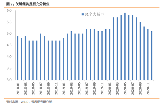 除了经济增长目标,疫情以来央行多次强调“更加重视就业目标”(比如2020年一季度《货币政策执行报告》、易纲行长《建设现代中央银行制度》[1]、孙国峰司长《健全现代货币政策框架》[2]等),这意味着在就业目标(建议观察31个大城市城镇调查失业率能否持续回落至5%以内,以证明经济实现充分就业)达成之前,货币政策难以完全转向,对于未来通胀的容忍度也有所提升,可能呈现一种收而不紧的状态。