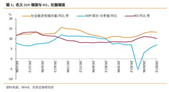 孙国峰的文章明确“2018-2019年实现了大致相当”,2019年名义GDP增速7.24%,对应M2、社融增速8.7%、10.69%。2020年M2、社融增速是10.1%、13.3%。因而,从反映潜在增速的名义GDP增速来看,合理引导2021年M2、社融增速下行仍然政策诉求,所以稳字当头首先考虑的是稳杠杆。