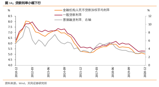 四季度MLF利率和LPR均保持不变,贷款利率出现小幅下降,贷款加权平均利率、一般贷款利率、票据融资利率、个人住房贷款利率分别较三季度下降了9BP、1BP、13BP、2BP,并且也低于2020年底的水平。