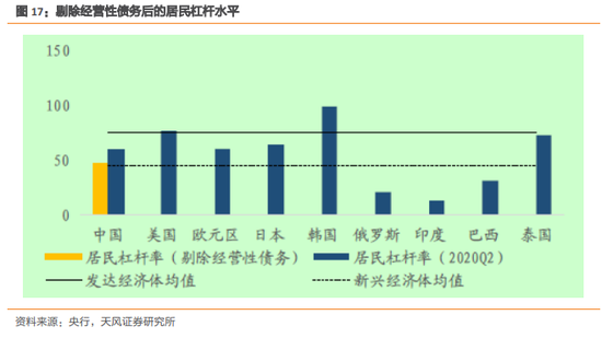 一、衡量居民杠杆需要剔除经营性债务。我国居民部门借贷部分从事于经营性活动(占比约为20%),主要来自个体工商户的经营性贷款和通过消费贷、信用卡资金经营周转,实质类似于企业债务,这是我国居民杠杆率与其他主要经济体的关键差异。因此,观察和比较我国居民杠杆率,应剔除经营性债务的影响。