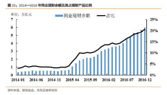 影子银行风险加剧。2015-2016年,银行表内资产借助通道表外化的监管套利现象非常突出,其中同业理财是一种最简易的以转移出表为目标的影子银行业务。商业银行通过发行理财产品承接本行信贷资产,其他银行以同业理财形式购入,通常还会签署回购协议。参与者分别承担资产出表、发行理财、同业投资和担保回购等不同角色,资金空转特征非常突出。2016 年末同业理财占比超过20%,两年内增长了10 倍以上,同时其他类型的影子银行规模也在快速膨胀。