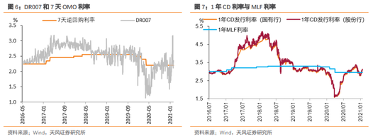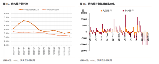 此外,央行还继续强调存款基准利率作为“压舱石”的重要性、保持银行负债成本稳定,以及通过LPR改革带动存款利率逐步走向市场化(1月15日央行新闻发布会中孙国峰还提到“贷款利率下行引导银行降低负债成本,推动存款利率下行。2020年12月三年期和五年期存款加权平均利率分别为3.67%和3.9%,分别较上年末下降5个基点和16个基点”),不排除今年结构性存款仍有进一步压降的可能。