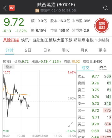 2月9日晚间,陕西黑猫公告表示,第三大股东长城基金拟清仓减持。今早开盘,陕西黑猫股价跳空高开后震荡向下,截至发稿,跌1.32%,报9.72元/股。