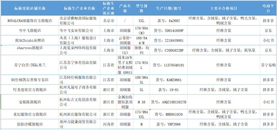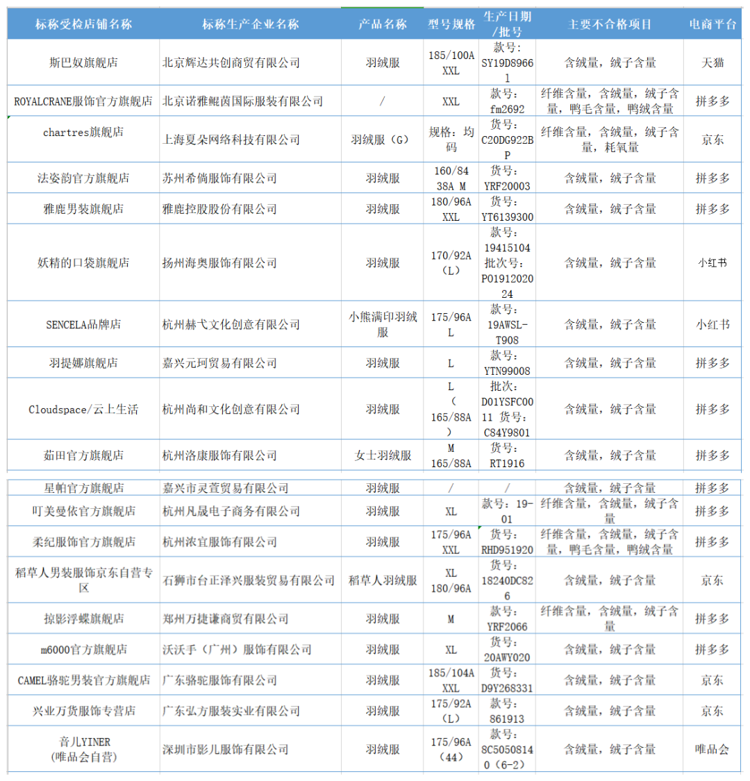 其中,不合格产品包括:叮美曼依官方旗舰店在拼多多平台上销售的标称杭州凡晟电子商务有限公司生产的羽绒服(款号:19-01)