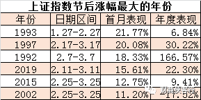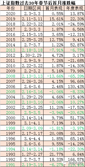 从上表可以看出,上证指数在过去30年,春节后一个月内,只有8个年份录得下跌,分别是2013年、2008年、2005年、2003年、2001年、1998年、1994年和1991年。