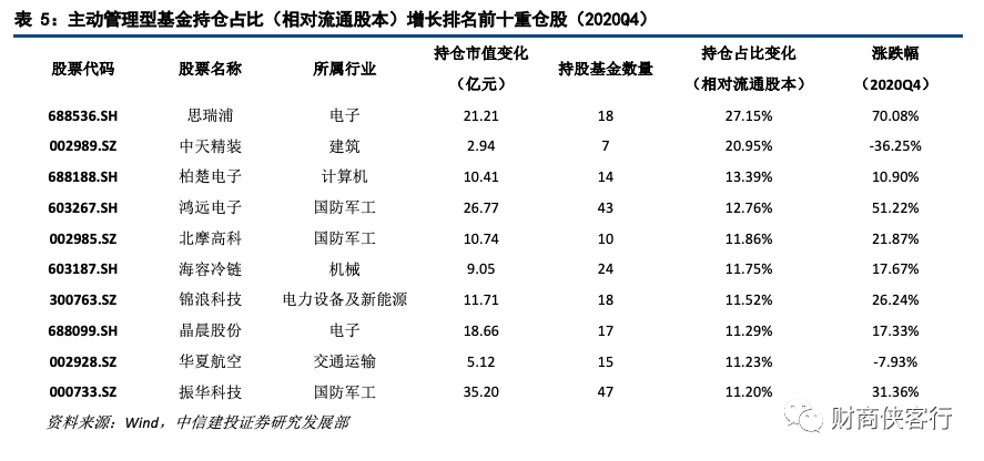 中信建投证券统计了主动权益型基金重仓股(剔除四季度新发上市股票)的持仓占比(相对自由流通股本)分布,截至2020年四季度末,基金增持比例最大的几只股票分别是思瑞普、中天精装、柏楚电子等,分布的行业主要是电子、国防军工等。