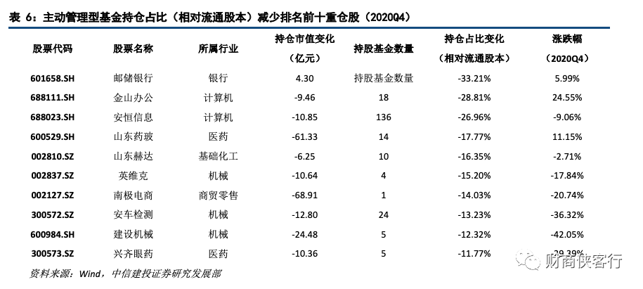 四季度基金减持幅度较大的则是计算机和机械行业,遭减持的个股业绩分化也相对较大,其中,南极电商(002127.SZ)报告期跌幅逾-20%,而金山办公(688111.SH)报告期涨幅近25%。