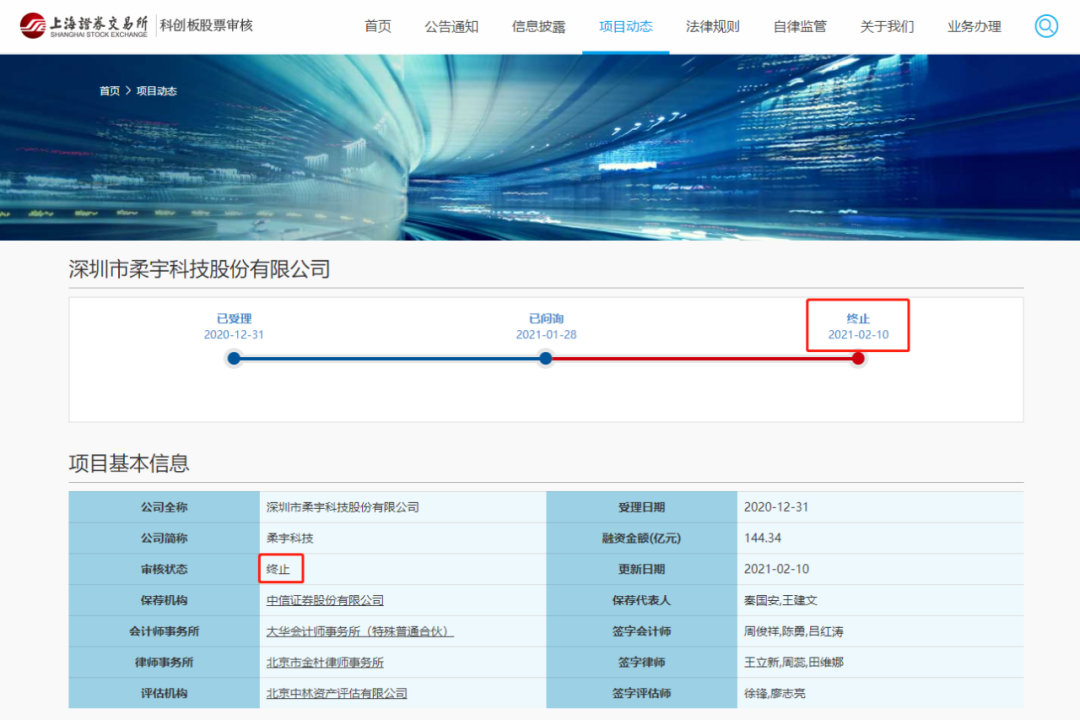2月10日晚间,上交所官网信息显示,柔宇科技科创板IPO审核状态变更为“终止”。同时,上交所披露终止柔宇科技上市审核决定显示,柔宇科技和保荐人中信证券在2月9日提交撤回上市申请文件的申请,上交所因此终止对其科创板上市审核。