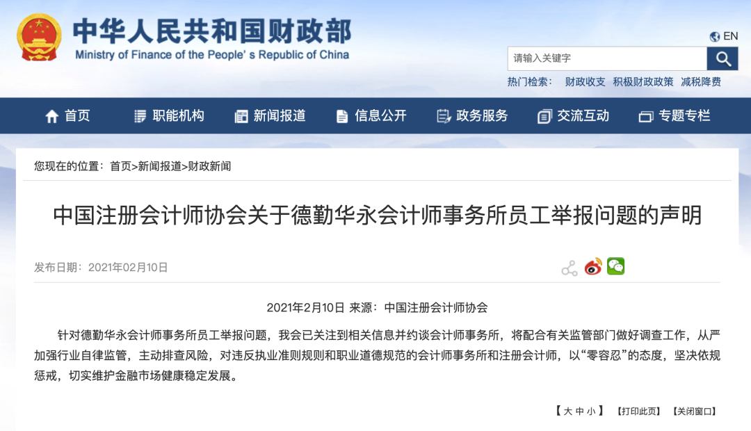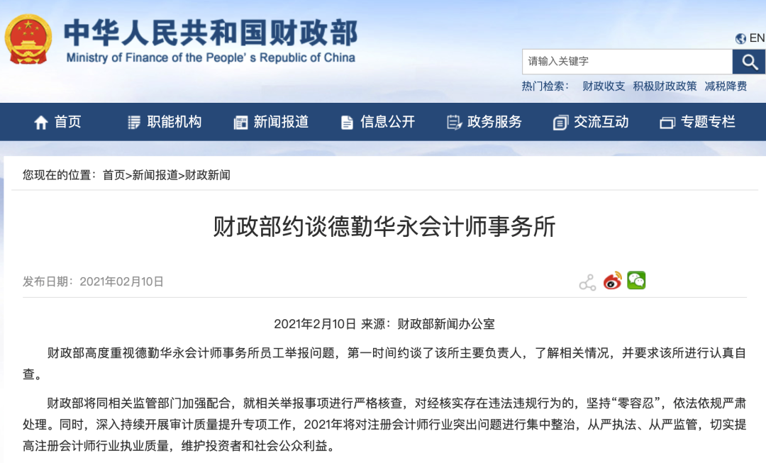 记者从财政部了解到,财政部高度重视德勤华永会计师事务所员工举报问题,第一时间约谈了该所主要负责人,了解相关情况,并要求该所进行认真自查。