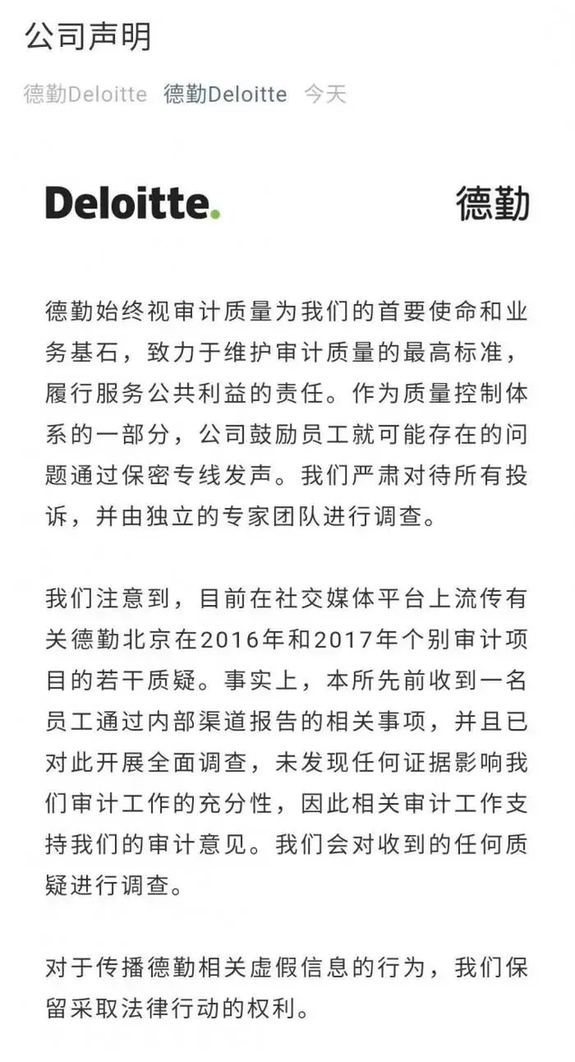 对于上述举报,德勤方面则在2月5日下午2点左右通过微信公众号发表声明称,先前已收到一名员工通过内部渠道报告的相关事项,称已对此开展全面调查,但未发现任何证据影响该所审计工作的充分性。