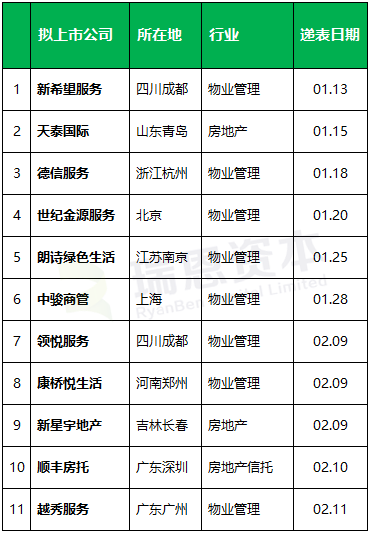 截至2021年2月10日,除了上述刚递表的11家之前,物业公司中还有来自上海的融信服务、来自广东深圳的禹佳生活服务等也在上市排队中;房地产公司中还有来自上海的三巽集团、来自广东江门的中国文旅集团,也在上市排队中。