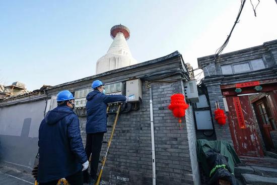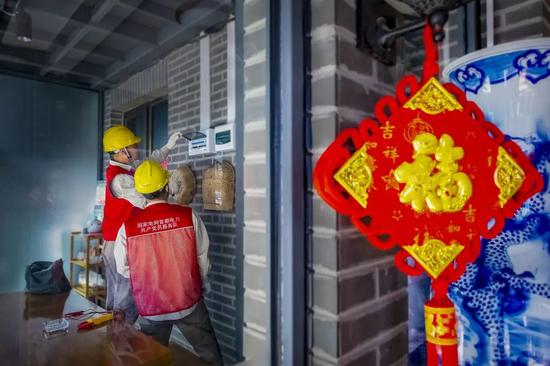 ▲国网首都电力共产党员服务队到村居民家中检查电力线路,确保安全用电