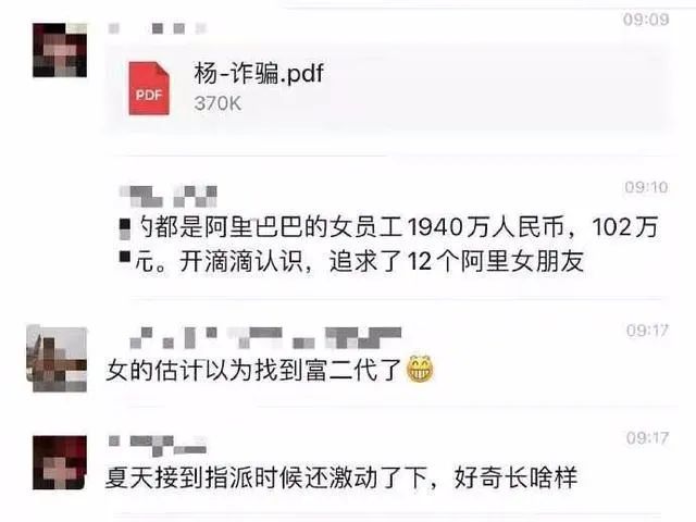 2月10日,据新浪微博网友爆料,一个初中文化水平男子开滴滴顺风车故意制造机会,追求了12个阿里女员工做女朋友,诈骗钱财共计1940万人民币,102万美元。