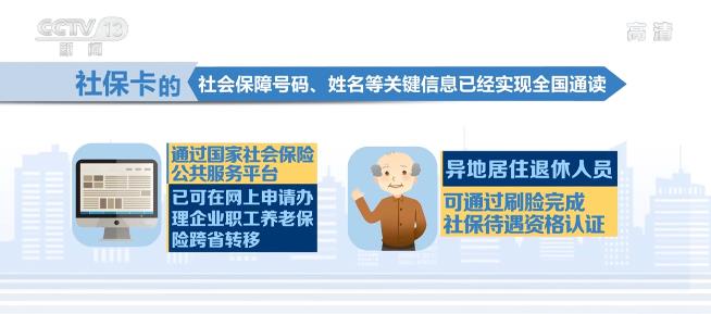 社保卡的社会保障号码、姓名等关键信息已经实现全国通读。目前通过国家社会保险公共服务平台,已可在网上申请办理企业职工养老保险跨省转移;异地居住退休人员,可通过刷脸完成社保待遇资格认证。