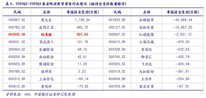 婚庆相关零售子行业的基金持仓也在悄然生变。银河零售团队表示,2020年第四季度,商贸零售行业基金持仓市值延续回落趋势,低配比例触及2017年以来最低水平。其中,珠宝首饰与化妆品等顺周期可选消费标的基金持仓和持股数量提升明显;超市与电商龙头受内外部扰动影响,延续环比下滑趋势。从持仓股数变动的角度来看,黄金珠宝、专业市场经营与化妆品板块最受市场青睐。