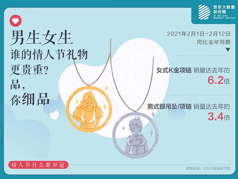 因为2020年疫情的缘故,2021年将有更多的新人步入婚礼殿堂。从京东大数据来看,婚庆礼品/用品在情人节前12天的销量达去年同期的55.1倍。珠宝首饰类商品整体销量达去年同期的3倍,其中男性消费者购买的女士K金项链和黄金吊坠的销量达去年同期的6.2倍;女性消费者则更多的选择黄金转运珠和银项链作为礼物相送,黄金转运珠的销量达去年同期的3.5倍,男士银吊坠/项链的销量达去年同期的3.4倍。