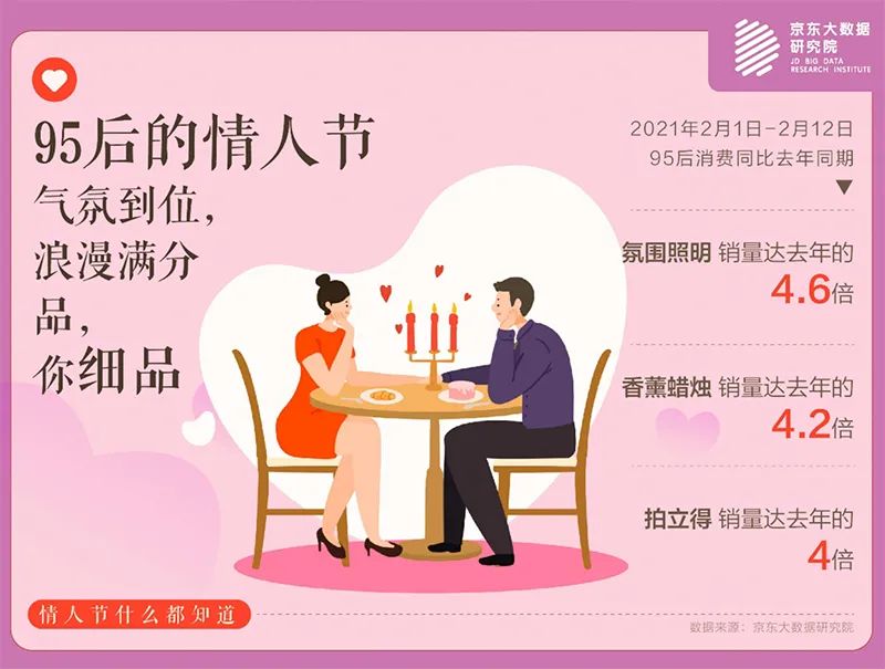 从京东大数据来看,95后成为最会制造浪漫氛围的群体,购买的氛围照明(灯饰)、香薰蜡烛、拍立得等商品的销量分别达去年同期的4.6、4.2和4倍,95后购买设计师/潮牌服饰、戒指、唇彩唇蜜/唇釉这些商品中占比超过40%,预示了新一代消费的新风向。