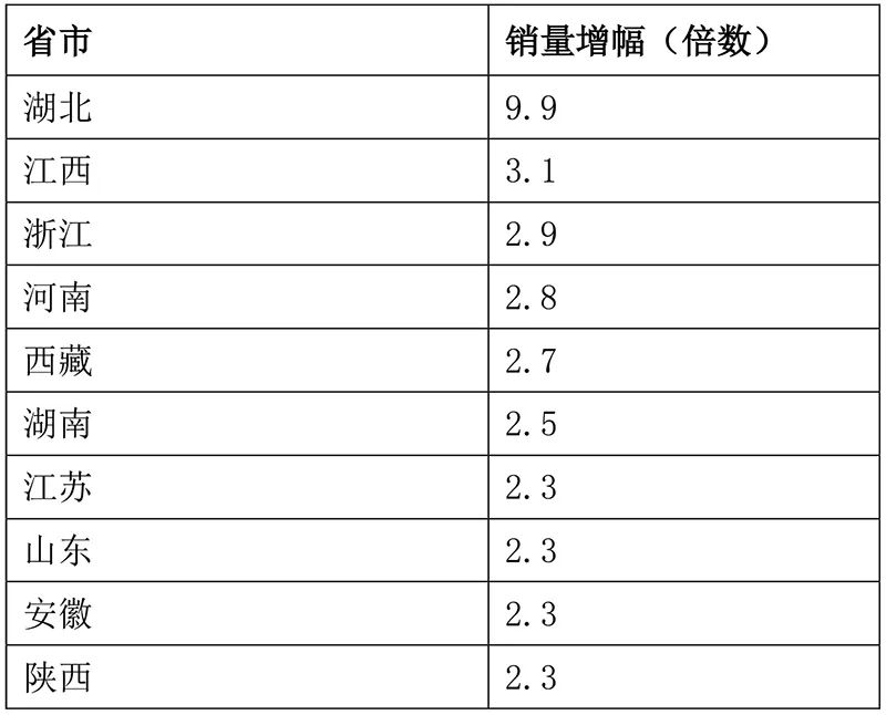 销量同比增幅TOP10省市