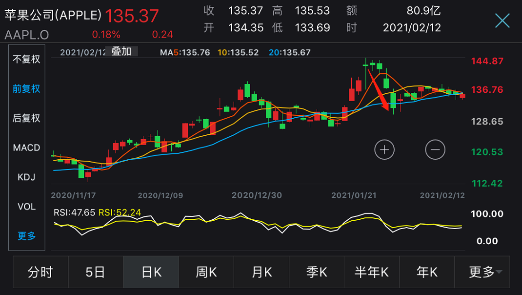 但在苹果发布财报之后,股价却在1月25日晚间创下历史新高144.87美元之后,开启了四连跌。