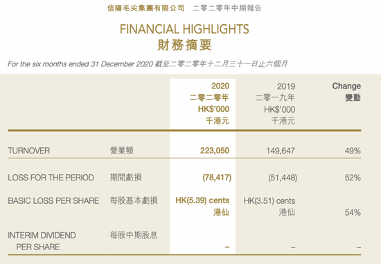 信阳毛尖最新的财报显示,2020年全年,公司实现营业收入2.23亿港币,同比增长49%,实现净利润亏损7841.7万港币。