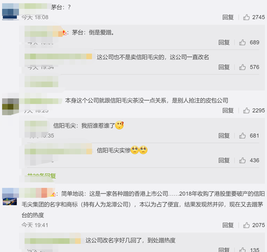 信阳毛尖拟更名“中国国龙茅台集团有限公司”的消息一经发布,就引来网友议论纷纷。有网友表示,“这公司改名字好几回了,到处蹭热度”;还有网友称,“信阳毛尖实惨”“茅台:倒是爱蹭”。