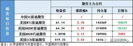 【1】WTI主力原油期货收涨1.63美元,涨幅2.71%,报61.14美元/桶;布伦特主力原油期货收涨1.61美元,涨幅2.54%,报64.34美元/桶;
