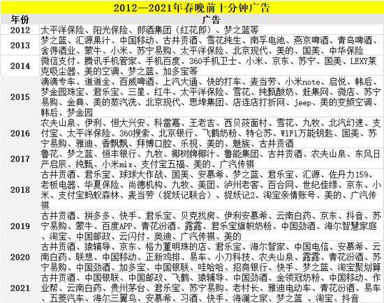 也正因此,2012年以后,春晚开播前几分钟的黄金时段,成了最紧俏的广告时间。