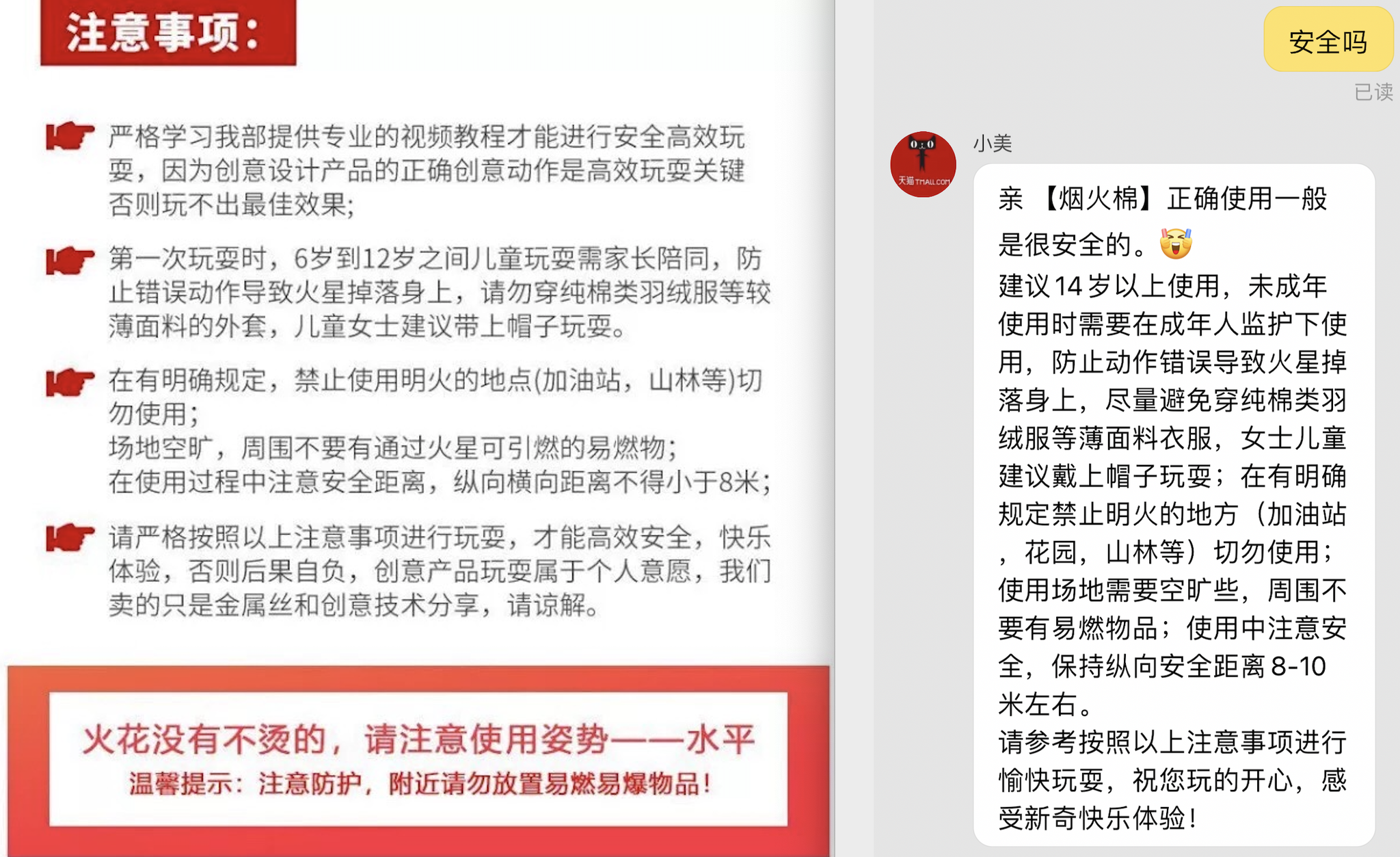 至于记者询问“钢丝棉烟花”是否安全可靠时,相关网店客服回应,使用时需要自己多注意安全,并附上使用说明。其中强调:“请严格按照以上注意事项进行玩耍,才能高效安全,快乐体验,否则后果自负,创意产品玩耍属于个人意愿,我们卖的只是金属丝和创意技术分享。”