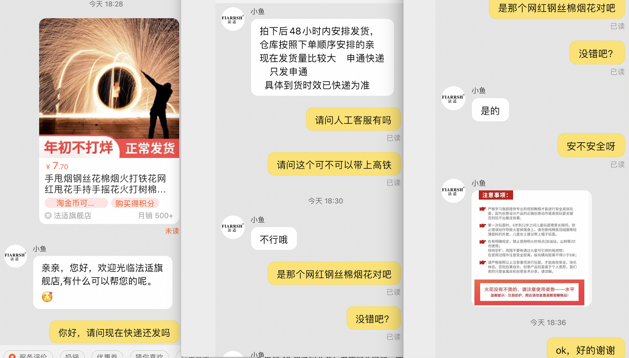 17日下午,澎湃新闻注意到,目前仍有不少商家在电商平台上公开出售“钢丝棉烟花”。记者咨询多家相关网店,客服表示,春节后会正常发货,按照下单顺序安排。有的客服则称,目前订单较多,发货量较大。