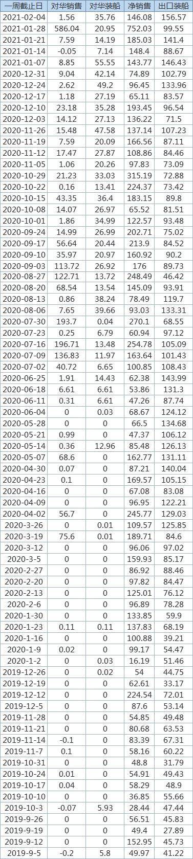 以下为2019/20年度以来美国玉米对中国出口销售情况:(单位:万吨)