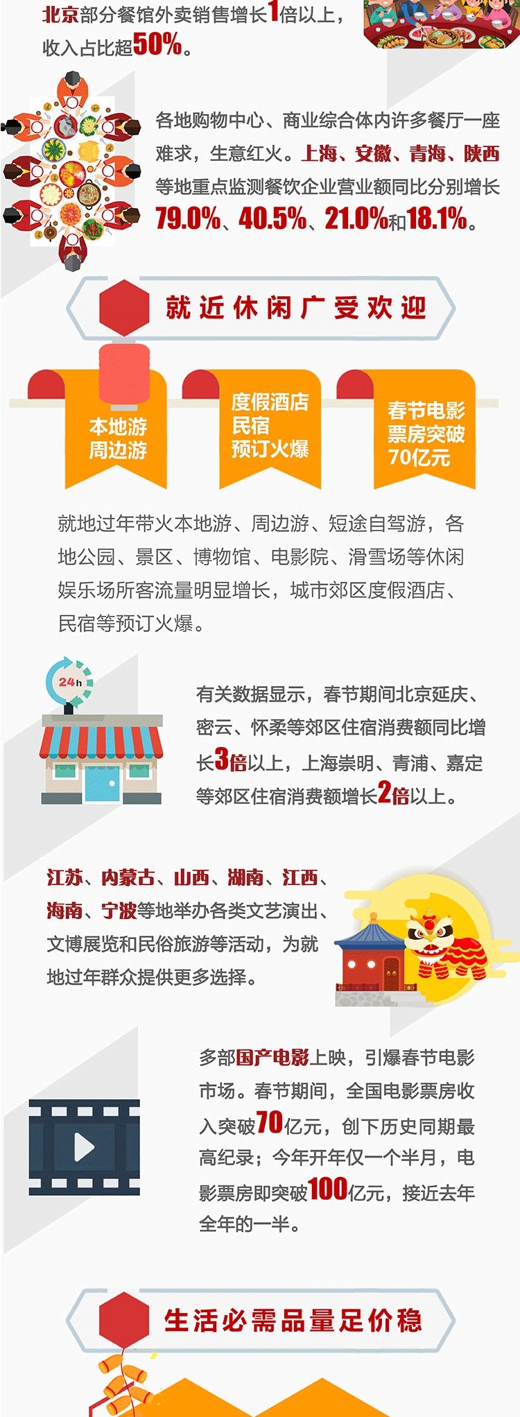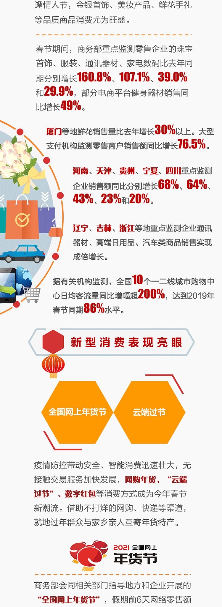 商务部数据显示,11日至17日,全国重点零售和餐饮企业实现销售额约8210亿元,比去年春节黄金周增长28.7%。