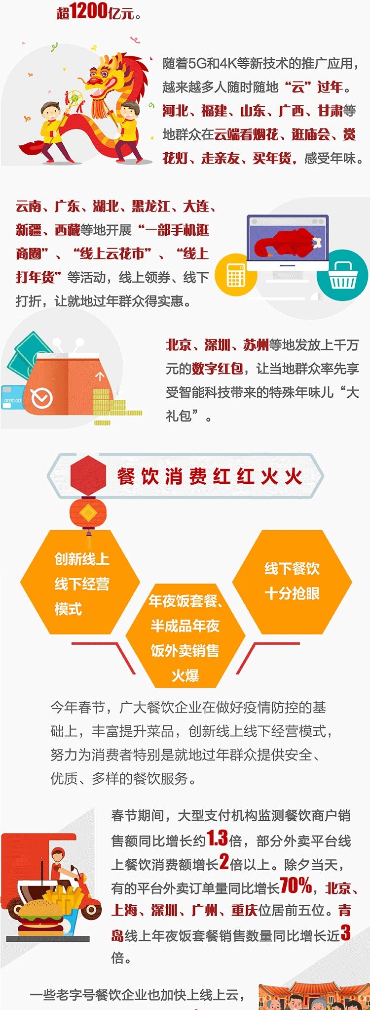 阿里发布报告显示,2021年春节有1亿人“原地过年”。飞猪平台数据显示,牛年春节期间“本地游”预订量同比涨超660%。此外,同程航旅数据显示,假期前六天周边游整体环比涨幅达289%,部分城市周边游同比增长300%以上。饿了么数据显示,春节期间,火锅、奶茶等外卖订单增幅均在2倍及以上。农历廿八至除夕,年夜饭半成品外卖同比增长4倍,单人份外卖订单同比翻一番,在一二线城市中尤为明显。