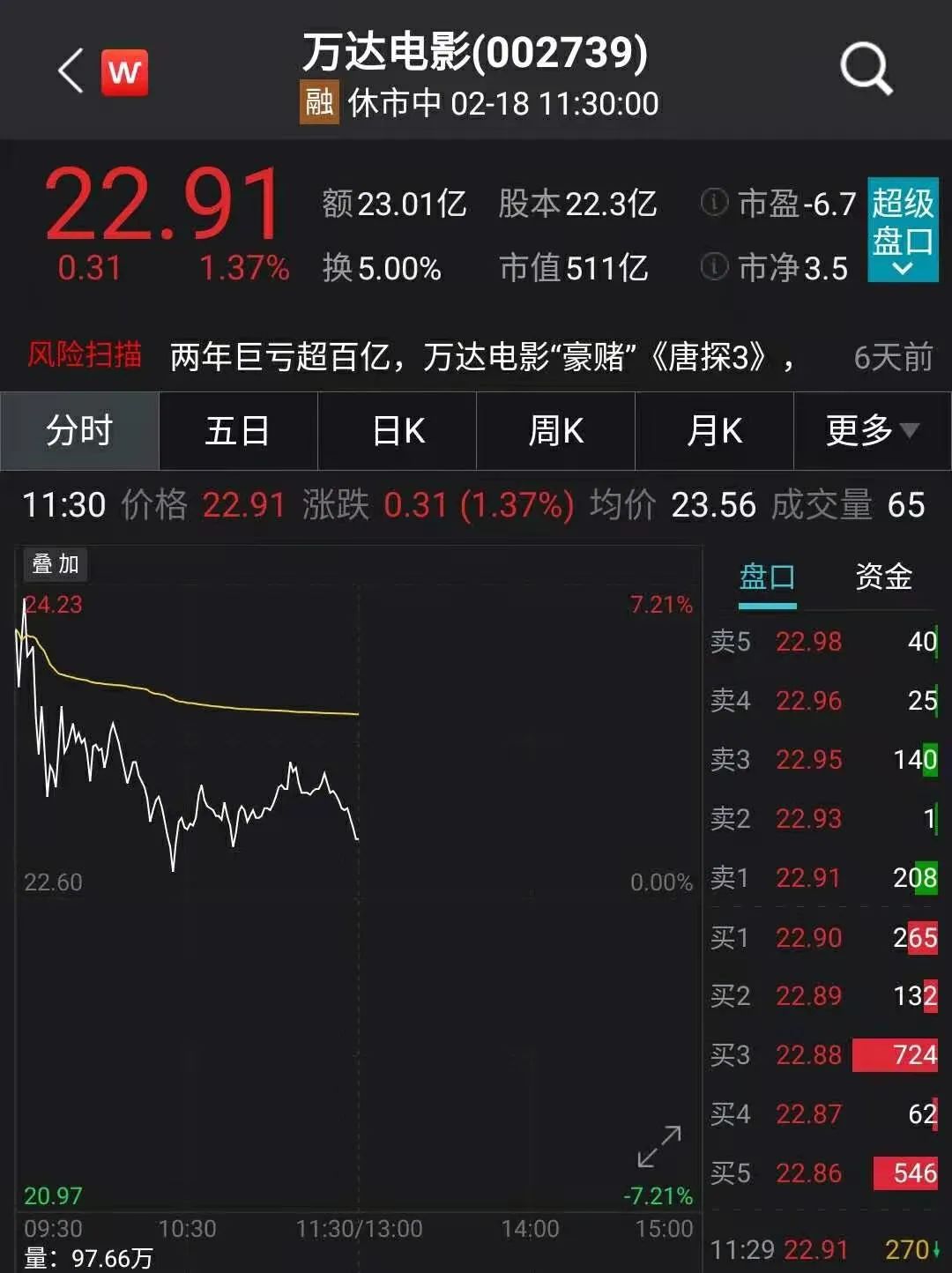 万达电影今天上午开盘一度飙至7.21%,但后续便快速跳水,截至午间收盘涨幅缩水至1.37%。