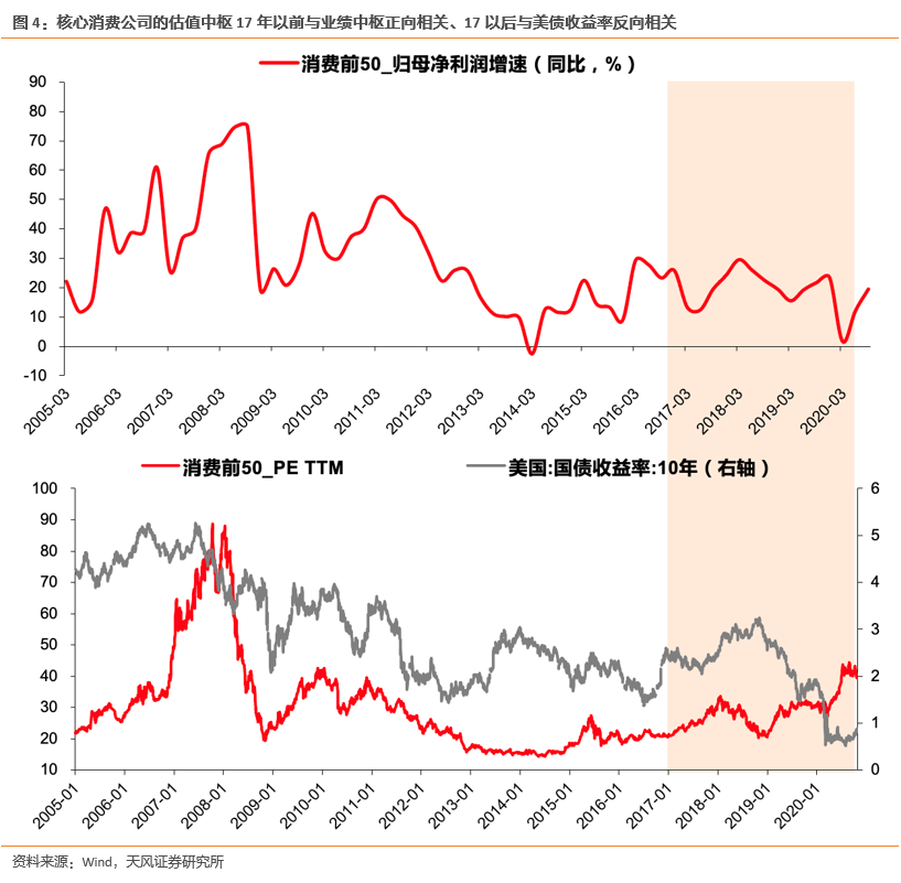 更确切地说,核心消费公司的估值与美债收益率的反向相关性极强,而与短期业绩关联度明显下降。