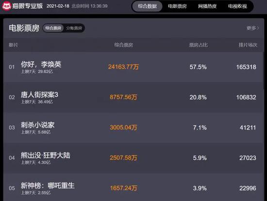 截至2月18日中午,《你好,李焕英》《唐人街探案3》两部影片分别以29.62亿元、36.49亿元票房领跑明显,占据档期总票房的77%。《刺杀小说家》以5.68亿元、《熊出没·狂野大陆》以4.3亿元、《新神榜:哪吒重生》以2.55亿元、《侍神令》以2.15亿元、《人潮汹涌》以1.64亿元跟随其后。