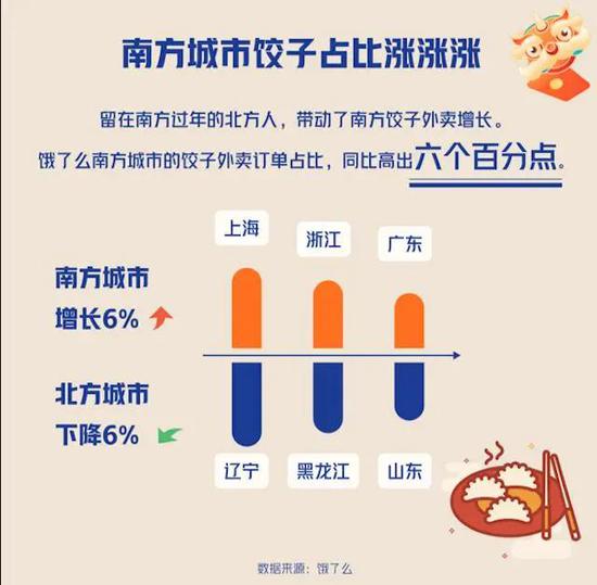 除夕新春吃饺子,一直是大多数北方人的春节习俗。今年不少选择留在南方过年的北方人,依旧在南方保留了这个传统年俗,由此拉动了新春南方饺子外卖消费的明显增长。