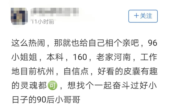 “96小姐姐,本科,160,老家河南,工作目前杭州,自信点,好看的皮囊有趣的灵魂都可,想找个一起奋斗过好小日子的90后小哥哥。”