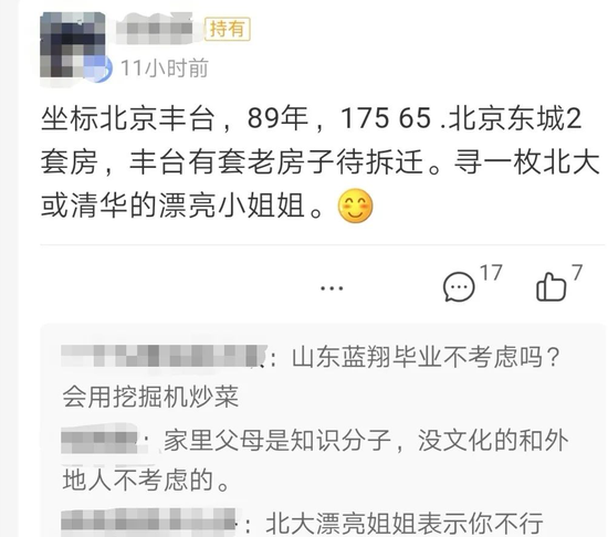 “坐标北京丰台,89年,175、65,北京东城2套房,丰台有套老房子待拆迁。寻一枚北大清华的漂亮小姐姐。”