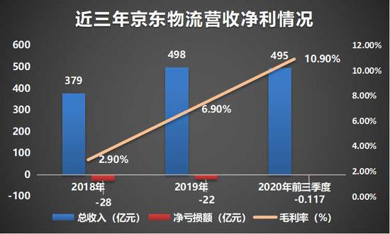 业绩大幅扭亏的同时,京东毛利率也在不断提升,2018年、2019年以及2020年前三季度分别为2.9%、6.9%、10.9%。去年三季度,中通、顺丰、圆通、韵达、申通的毛利率分别为23.46%、18.12%、10.15%、9.99%和2.95%,京东物流毛利率位于行业中部。