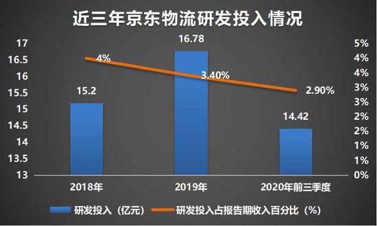 不过从招股书可以看到,研发开支是京东物流投入最大的开支项之一。2018年、2019年及2020年前三季度,京东物流用于研发的费用分别为15.2亿元、16.8亿元和14亿元,这 11个季度,京东物流累计技术投入达到46亿元。