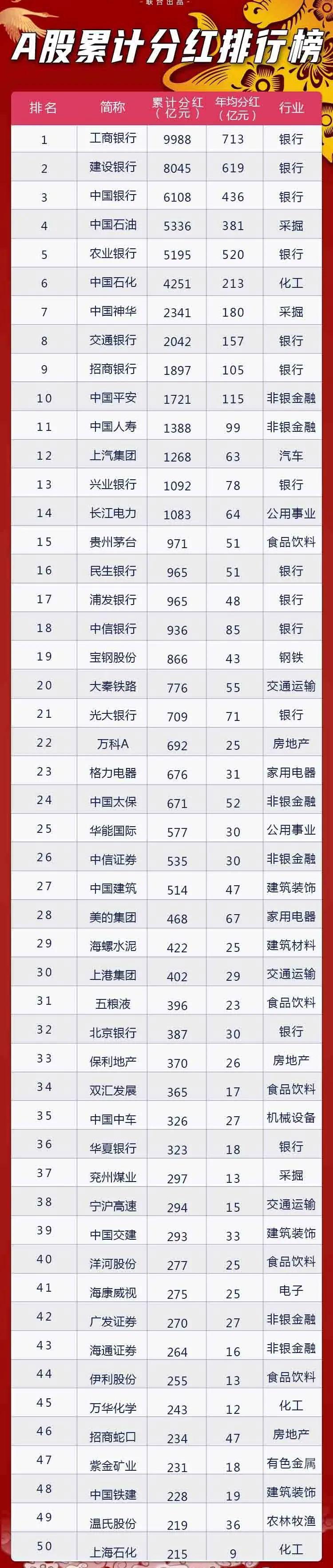 四大行囊括了A股累计分红排行榜的前3名和第5名,工商银行在14年里累计分红额高达9988亿元,高居第一,距离万亿分红总额仅一步之遥。建设银行以8045亿元的分红总额屈居第二,除金融股外,中国石油、中国石化、中国神华等能源股也是累计分红排行榜的明星。
