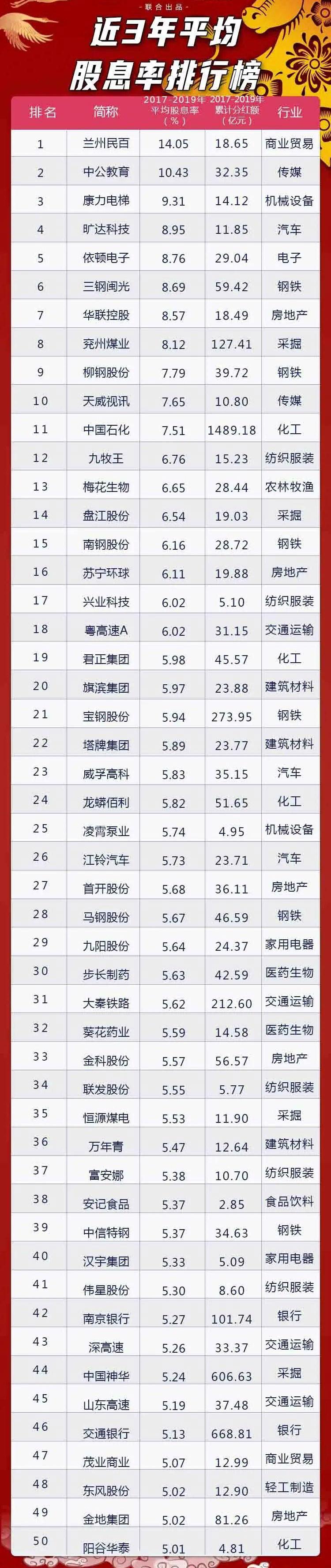 股息率与股价挂钩,是最能体现投资者的分红收益率,也是机构投资者最为看重的指标之一。数据统计显示,2017-2019年连续3年分红的股票中,50股的3年平均股息率超过5%,主要分布在钢铁、纺织服装、房地产行业中,分别有6只、5只、5只。