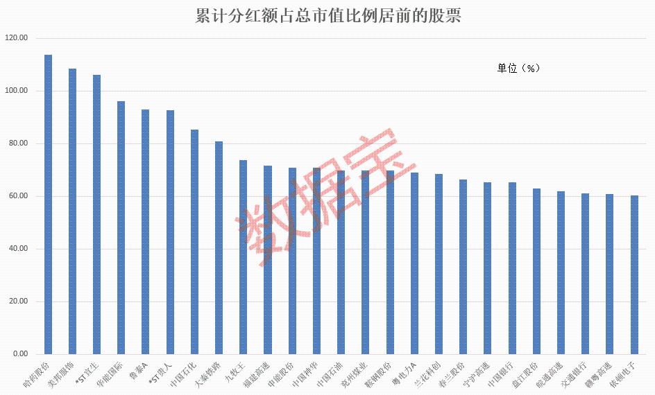 哈药股份自上市以来累计分红18次,分红金额为73亿元,其最新总市值为64.18亿元,累计分红额占总市值比例高达113.74%。此外,美邦服饰、*ST宜生的累计分红占市值比例分别为108.6%、106.12%,分居二三名。
