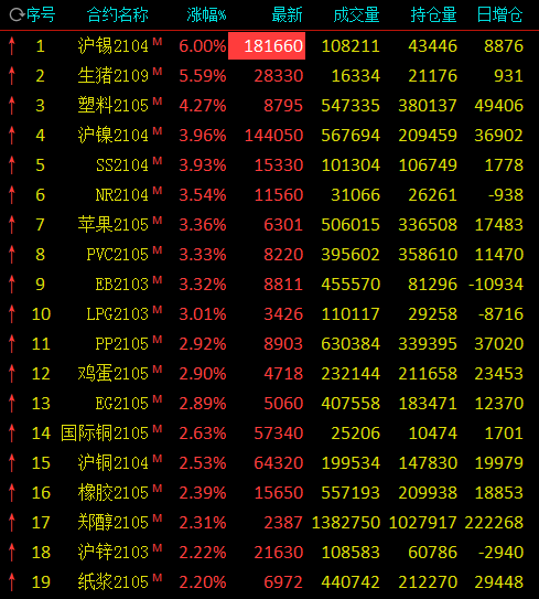 热点栏目2月19日,国内商品期市收盘涨多跌少,有色金属强势,沪锡涨停创新高,沪镍涨近4%,沪铜、沪锌、国际铜全线走高;化工品多数延续涨势,塑料涨逾4%,苯乙烯、PVC涨逾3%,聚丙烯、乙二醇涨近3%;原油系回落,原油、燃油跌逾2%;农副产品普遍上涨,生猪涨5.6%,苹果涨逾3%。