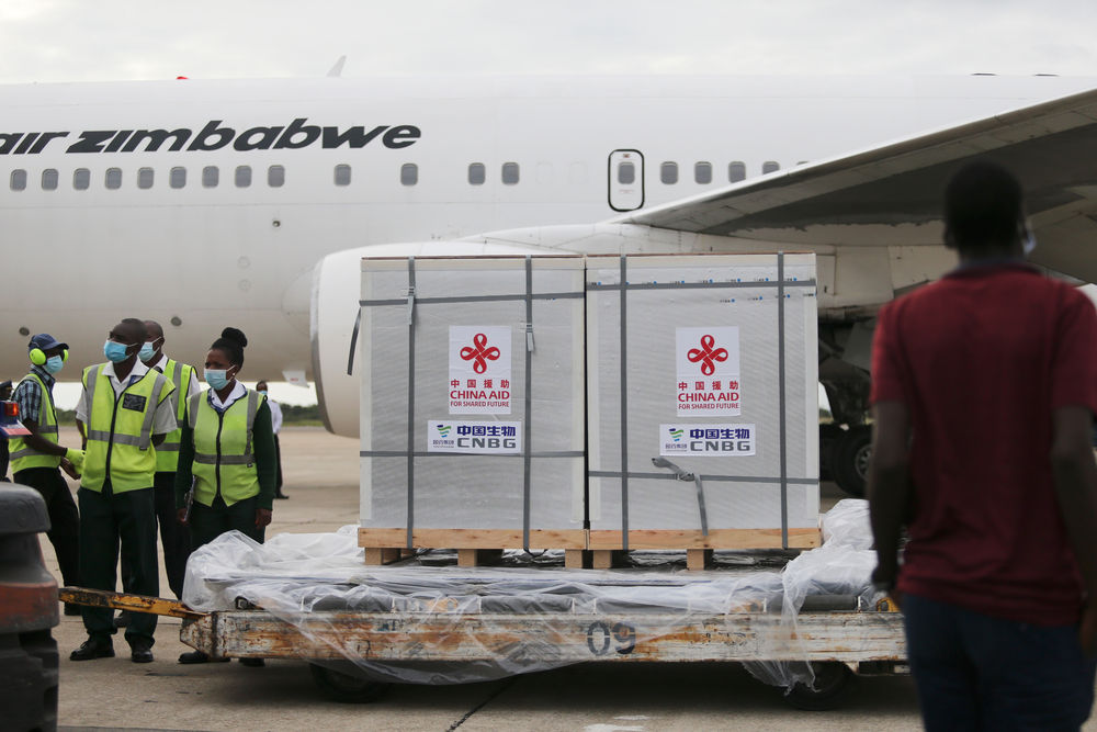 ↑2月15日,工作人员在津巴布韦首都哈拉雷的罗伯特·穆加贝机场卸载中国政府援助的新冠疫苗。